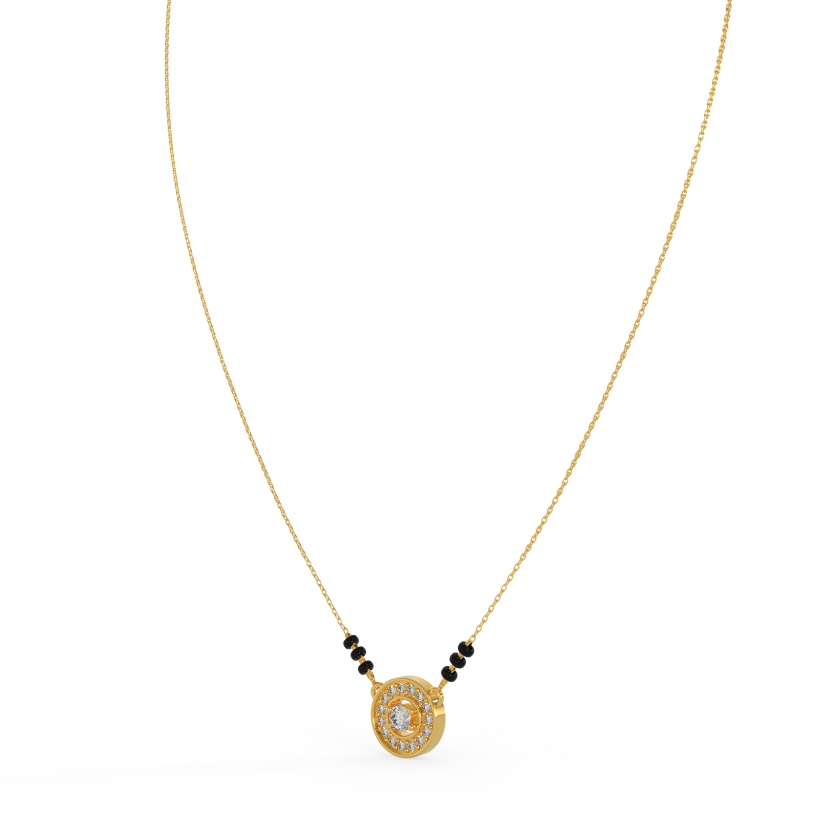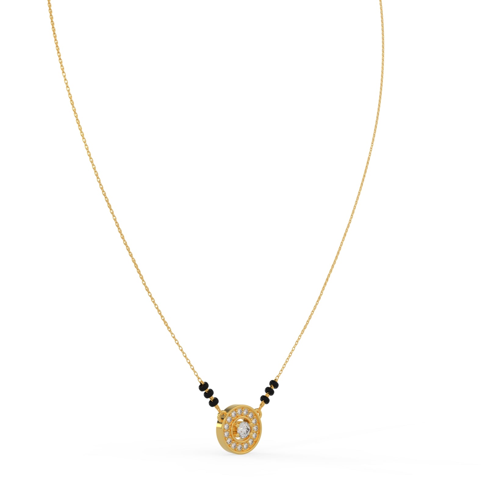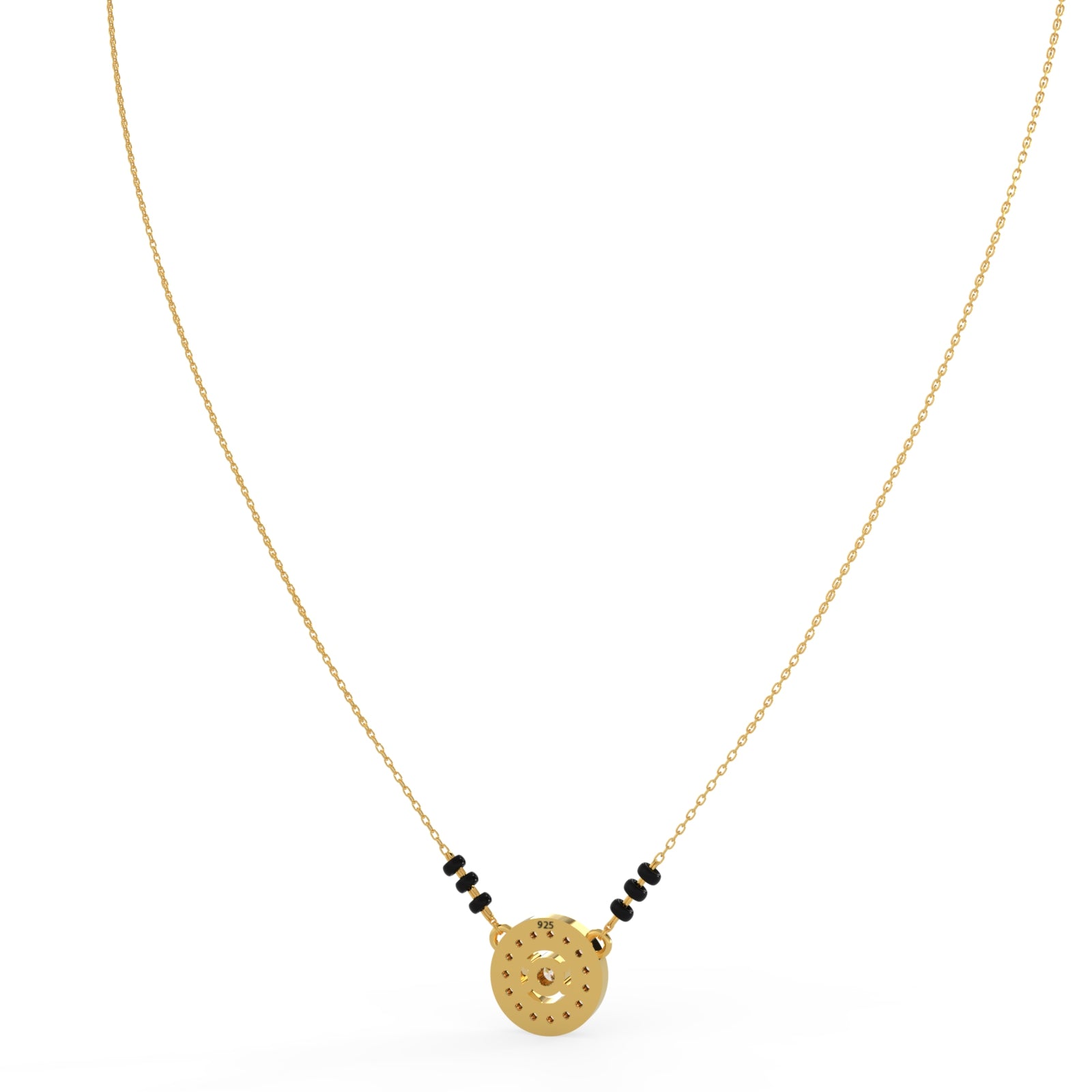 This elegant circular mangalsutra pendant is crafted in pure 92.5 silver with a radiant gold finish, featuring a sparkling stone-studded centerpiece. The round design, bordered with shimmering details, makes it a timeless piece that blends tradition with modern charm. Accented with black beads on either side, this pendant beautifully symbolizes togetherness and positivity while adding a refined touch to your daily or festive looks.