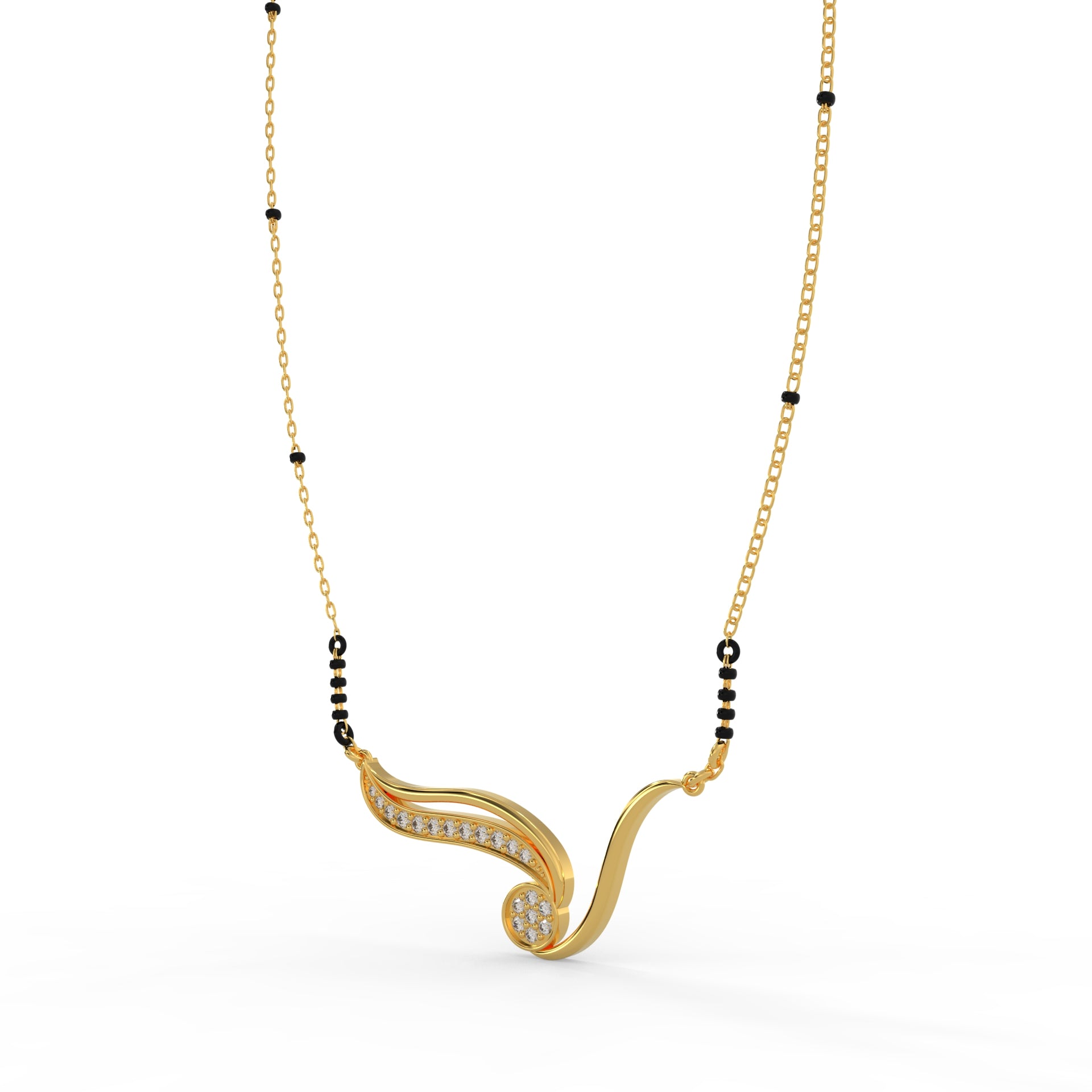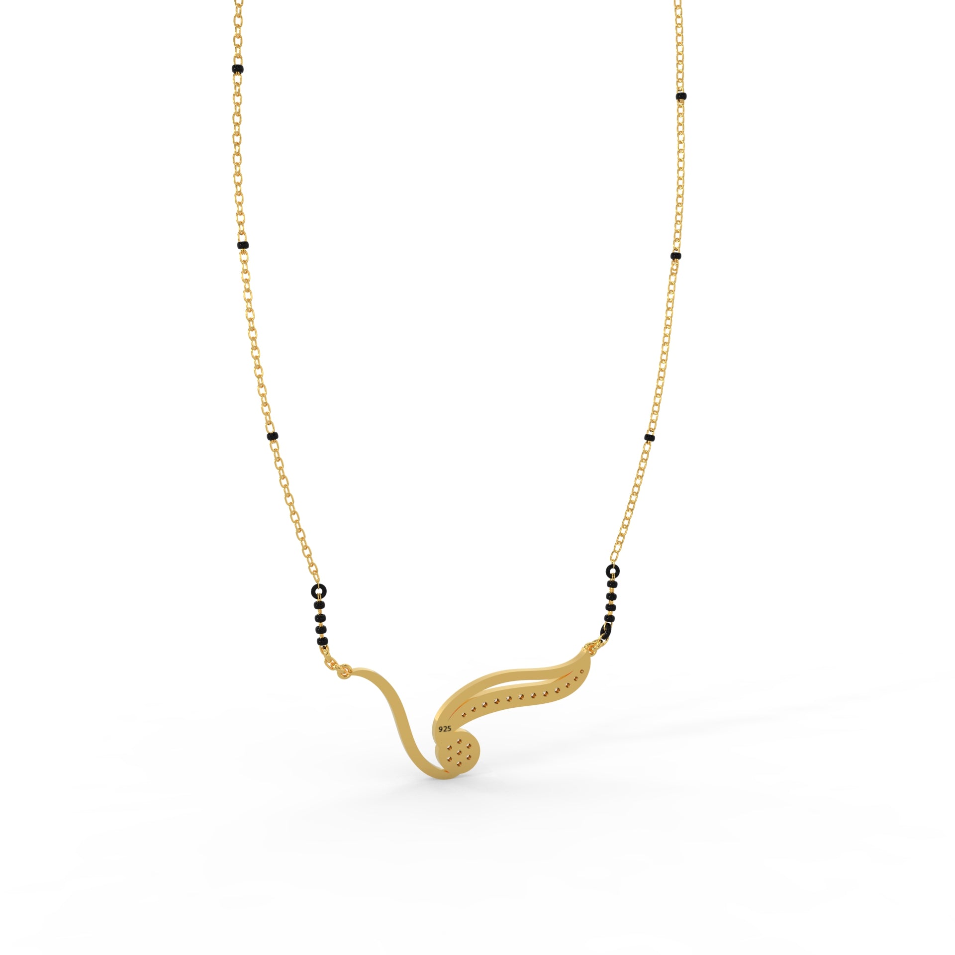 A graceful design that blends tradition with contemporary artistry, this 92.5 silver mangalsutra features a flowing wave-inspired pendant adorned with sparkling cubic zirconia stones. The sleek golden finish beautifully complements the traditional black beads, creating a perfect harmony of modern elegance and timeless symbolism. Lightweight and versatile, it is designed for everyday wear while carrying the deep significance of love and togetherness.