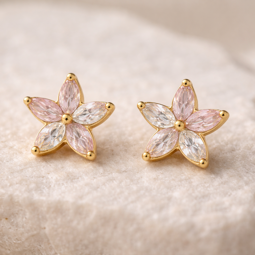 Graceful and feminine, these 92.5 silver earrings are shaped like a flower with pastel pink and white stone detailing within. The minimal yet intricate design adds a playful sophistication, making them a versatile piece for both everyday wear and special occasions.
