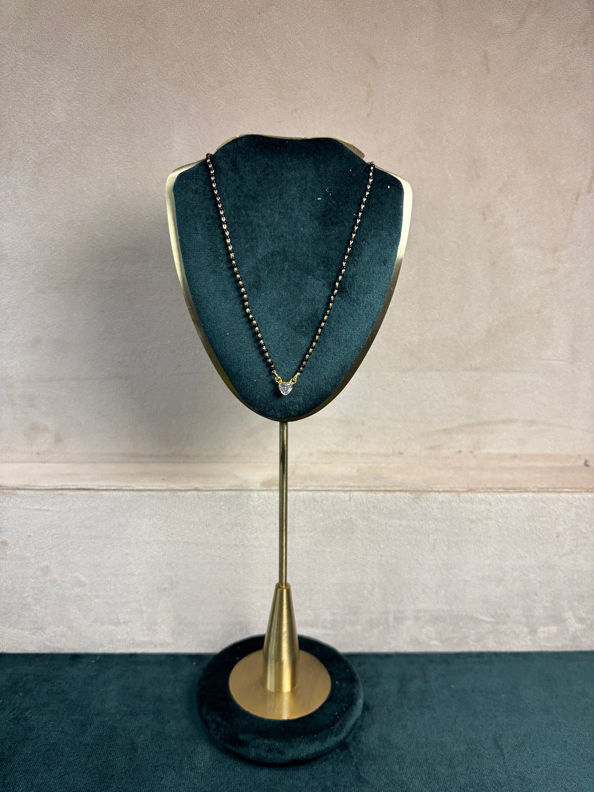 This elegant 92.5 silver mangalsutra features a delicate black bead chain with a radiant heart-shaped solitaire pendant at its center. The timeless design blends tradition with a touch of modern sparkle, making it a perfect symbol of love and elegance. Lightweight and versatile, it is ideal for daily wear while carrying a graceful charm.