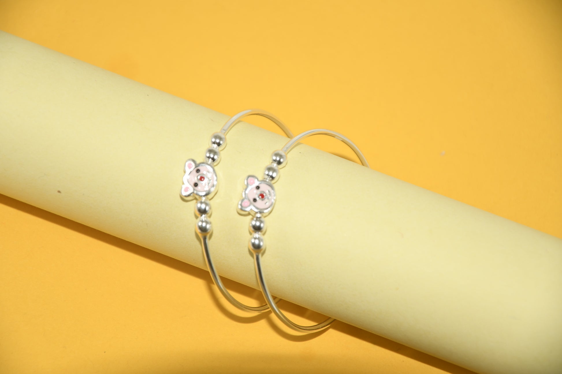 Delicate, pure, and full of charm: this pair of 92.5 Silver Adjustable Kadas features a cute Teddy charm. Designed especially for kids, these kadas combine the timeless beauty of sterling silver with a modern, minimal touch. The smooth silver beads and high-polish finish ensure lasting shine, while the slide-on style offers easy wear without any clasp or hinge. Gentle on delicate wrists, it’s a perfect keepsake that balances tradition and everyday comfort.