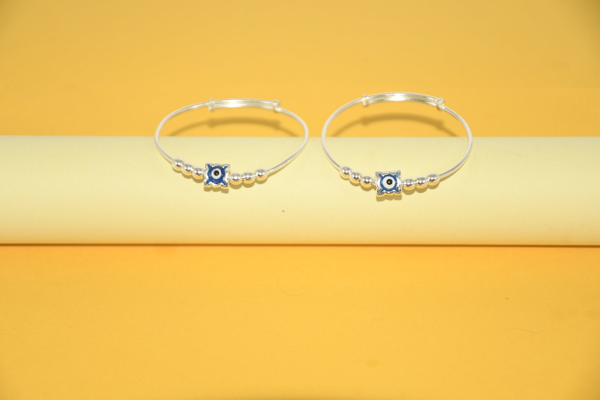 Delicate, pure, and full of charm: this pair of 92.5 Silver Adjustable Kadas features a Evil Eye charm .Designed especially for kids, these kadas combine the timeless beauty of sterling silver with a modern, minimal touch. The smooth silver beads and high-polish finish ensure lasting shine, while the slide-on style offers easy wear without any clasp or hinge. Gentle on delicate wrists, it’s a perfect keepsake that balances tradition and everyday comfort.