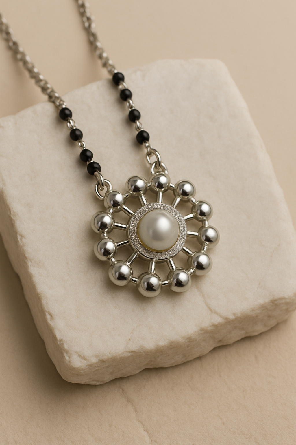 Celebrate tradition with a touch of modern elegance with this beautifully crafted 92.5 silver mangalsutra. Designed with a sleek black bead chain and a finely detailed pearl sun pendant, it symbolizes love, protection, and timeless beauty. Lightweight yet durable, this piece is perfect for both daily wear and special occasions.