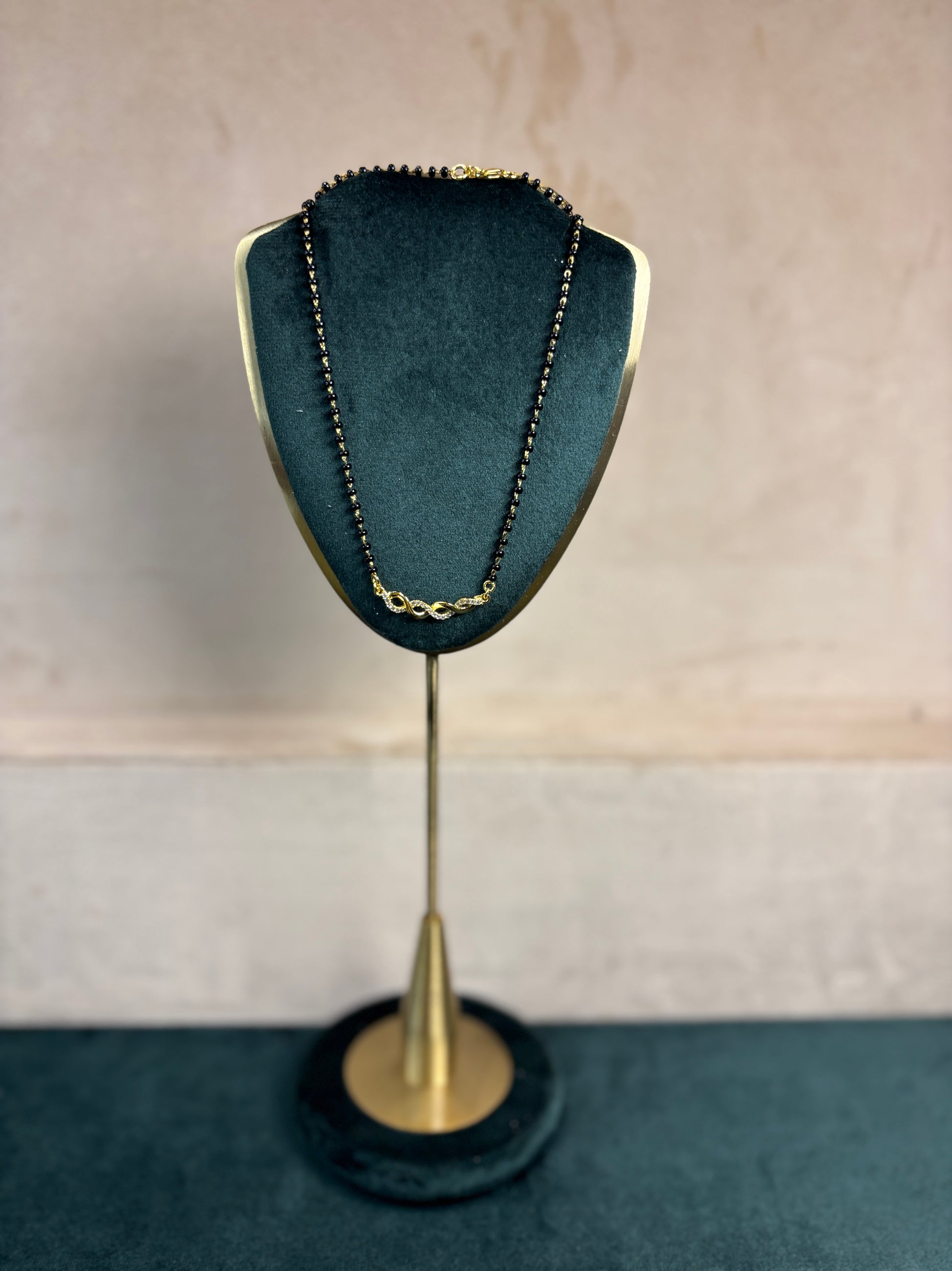 Celebrate tradition with a touch of modern elegance with this beautifully crafted 92.5 silver mangalsutra. Designed with a sleek black bead chain and a finely detailed infinity twirl pendant, it symbolizes love, protection, and timeless beauty. Lightweight yet durable, this piece is perfect for both daily wear and special occasions.
