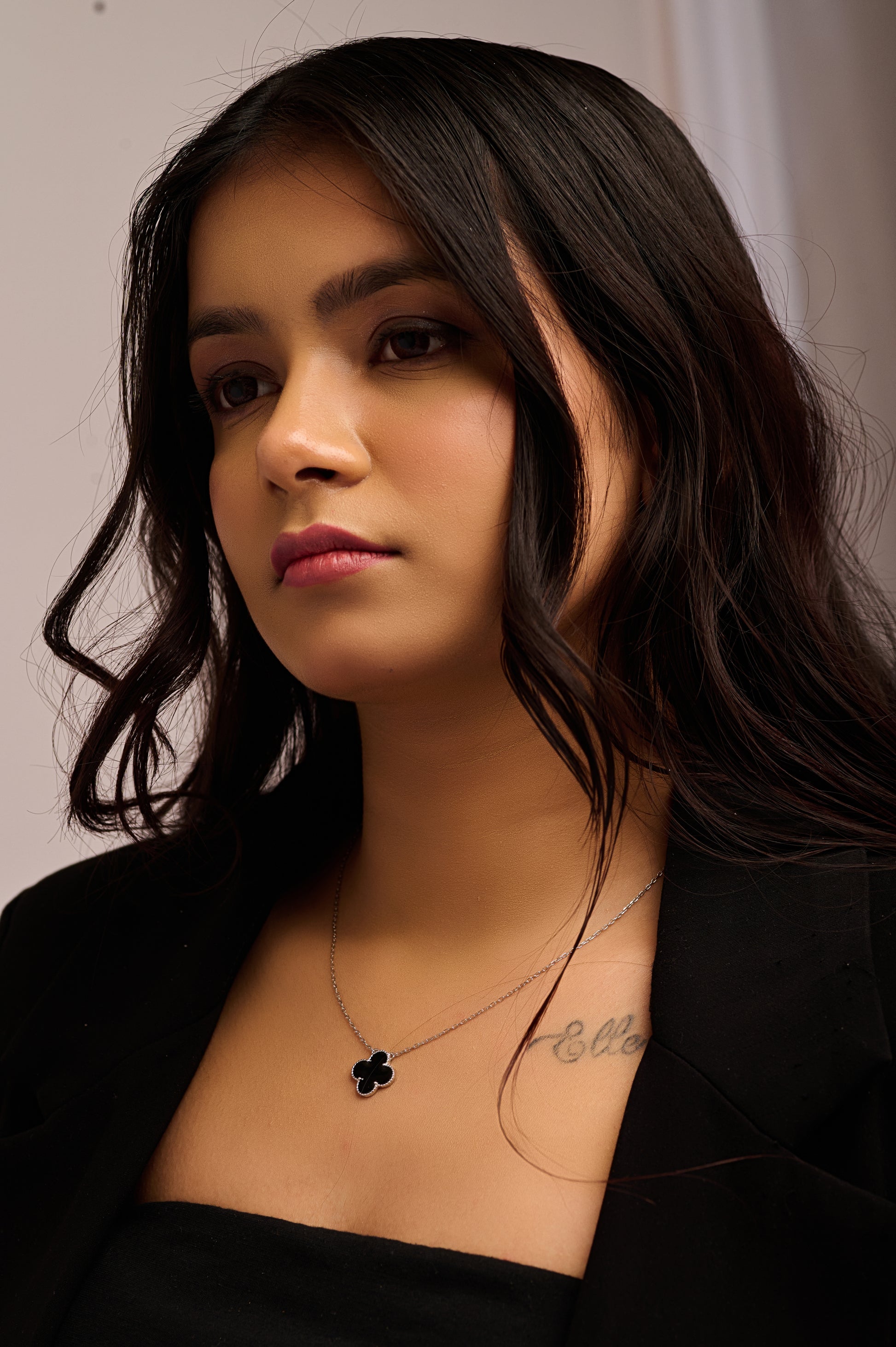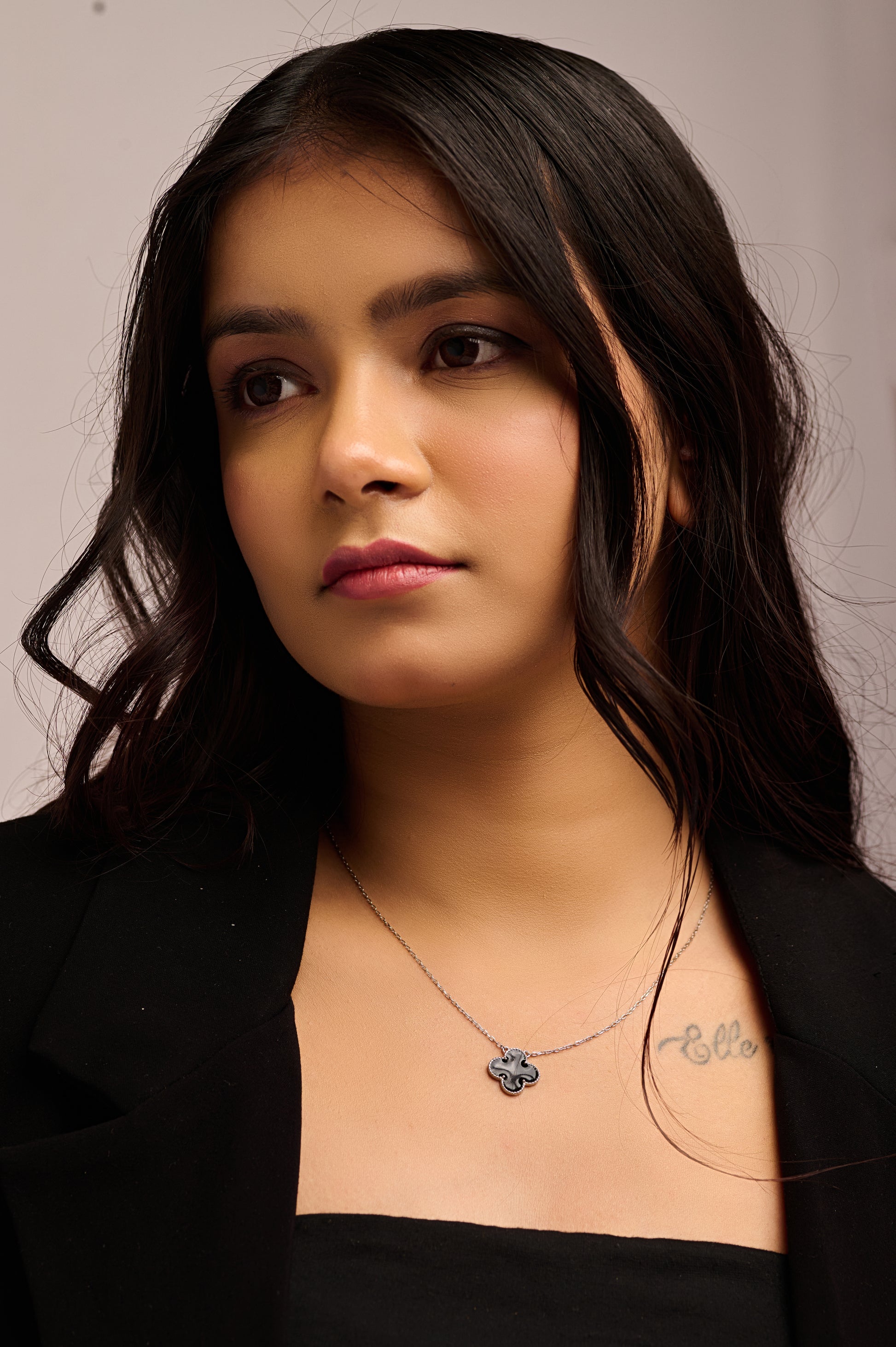 This four-leaf clover pendant is your daily charm for confidence and clarity. With its glossy black center framed in silver-detailed silver, it’s a fusion of minimalism and power.