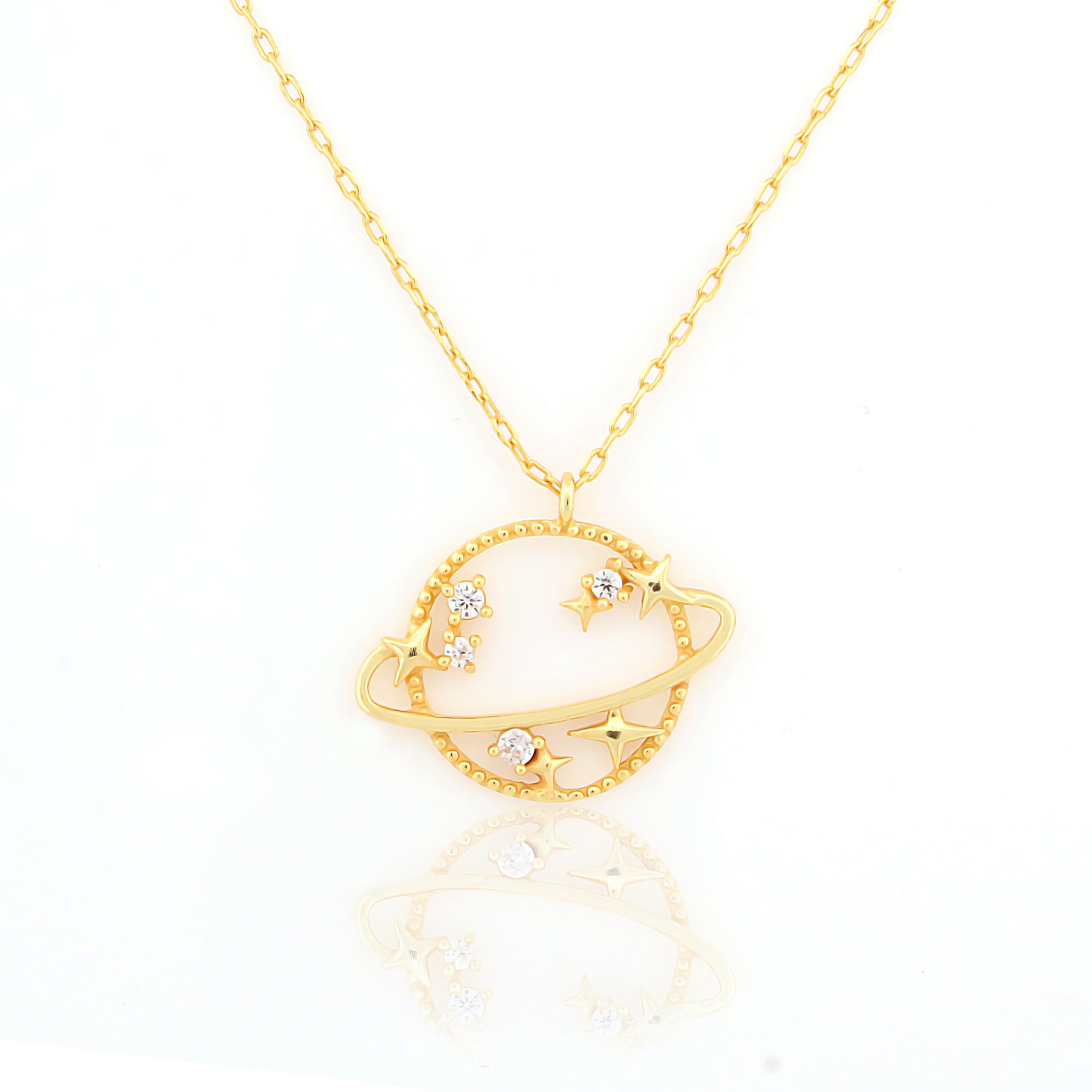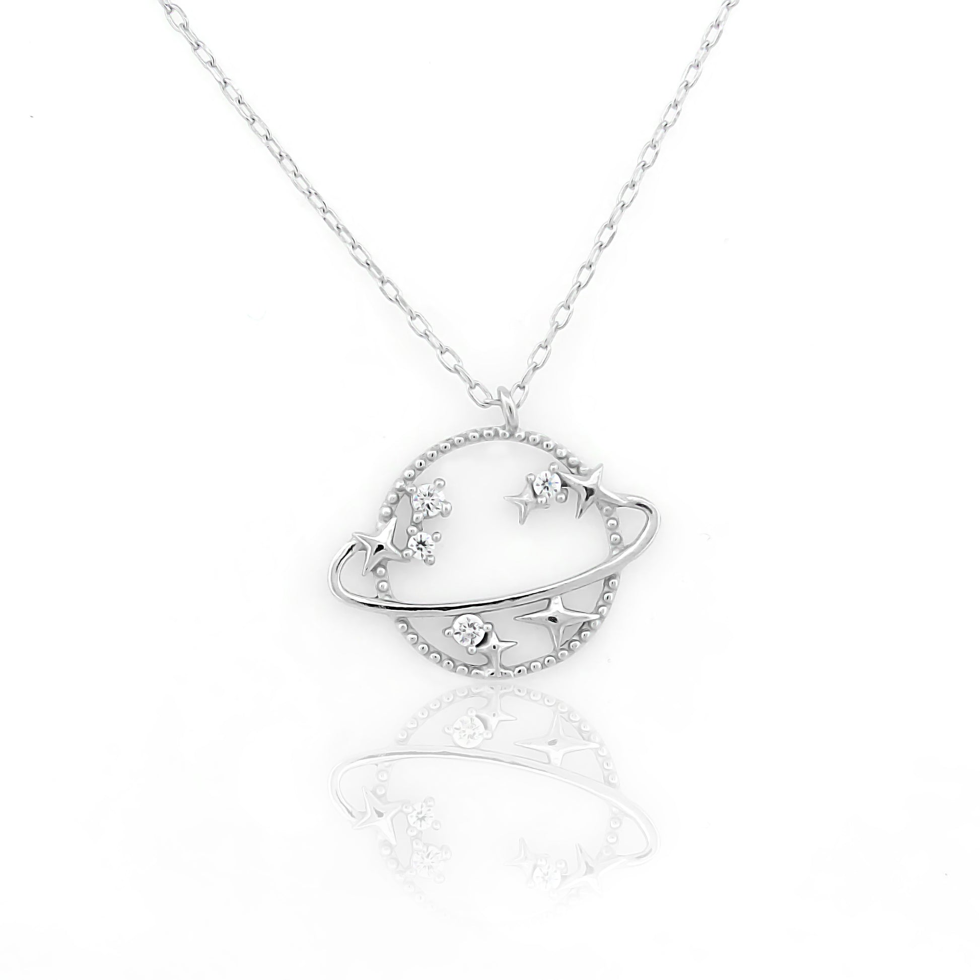 Inspired by the vastness of space and infinite dreams, this silver-tone pendant features a planet-like ring with delicate starry accents. A playful and elegant design, it invites imagination and curiosity into your everyday look—a personal universe close to your heart.