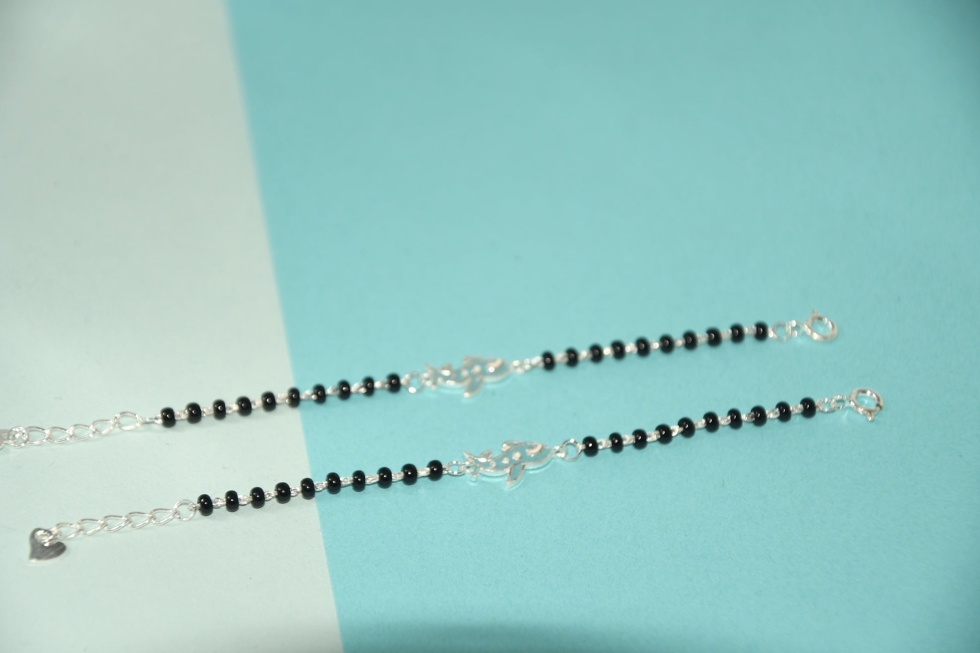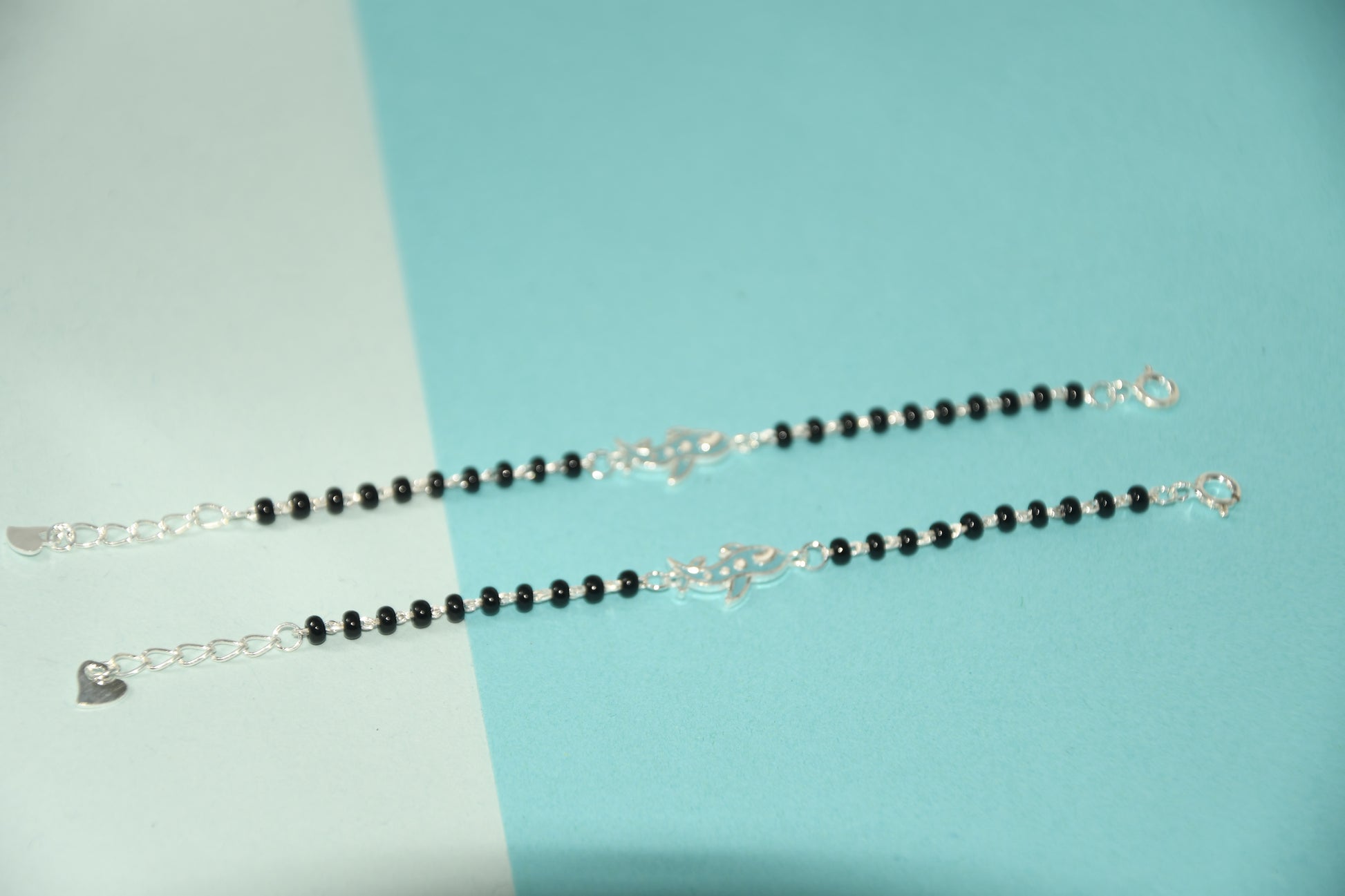 A delicate black beaded nazariya bracelet featuring a Light Blue Aeroplane Silver charm. Traditionally worn for protection, this adjustable piece blends cultural meaning with a touch of style.