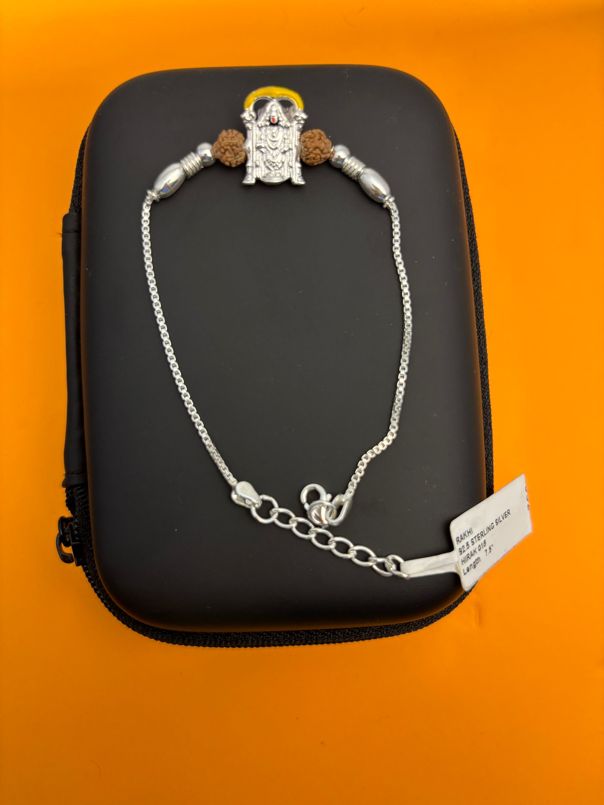 Crafted in 92.5 silver, this rakhi showcases a detailed carving of Lord Venkateshwara (Balaji) at the center, flanked by three delicate silver beads and sacred rudraksh on either side. Finished with a silver chain bracelet, it blends divine blessings, serenity, and elegance—an ideal gift to celebrate the enduring strength of sibling love this Raksha Bandhan.