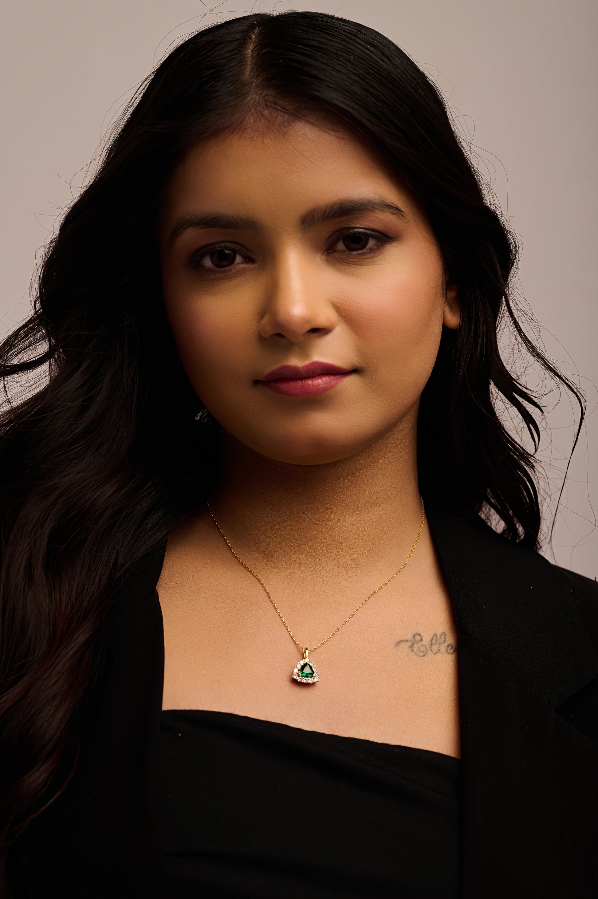 A triangle-cut green gemstone framed by shimmering silver —geometric, graceful, and grounded. This one’s for when you want to feel centered and stylish.