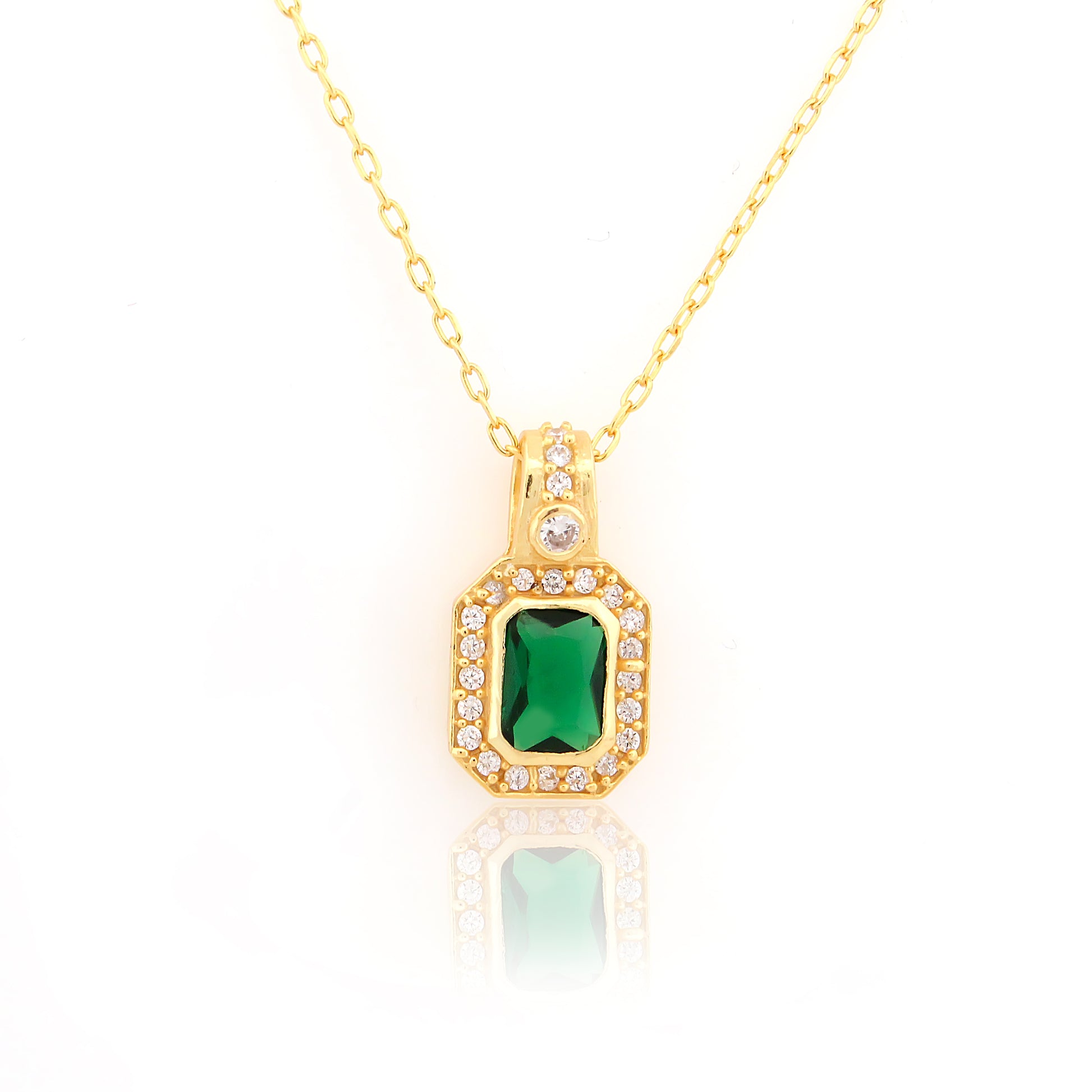 A pendant that gives vintage queen energy—with a deep green center stone in a double crystal border, it’s regal, bold, and unapologetically elegant.